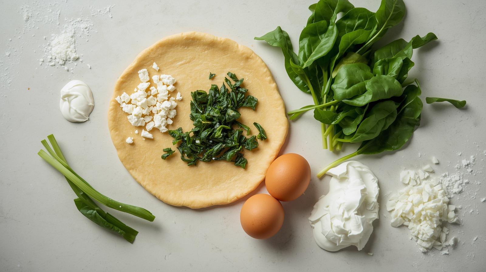 Étalez la pâte dans un moule à tarte, piquez le fond avec une fourchette. Répartissez les blettes, émiettez la feta par-dessus, puis versez l’appareil à base d’œufs.
